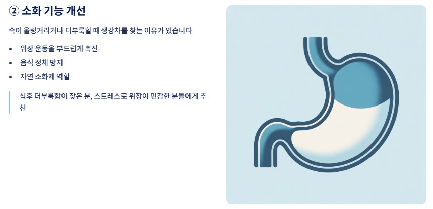 속이 울렁거리거나 더부룩할 때 생강차를 찾는 이유가 있습니다. 생강은 위장의 운동을 부드럽게 도와 음식이 정체되지 않도록 돕습니다.
