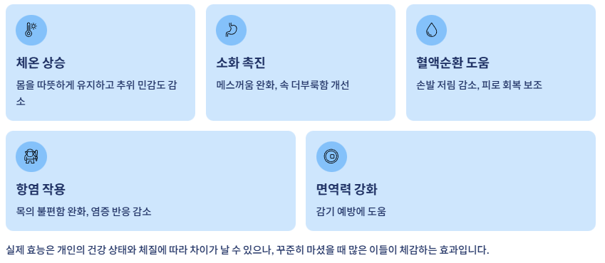 체온 조절, 소화 기능 보조, 혈액순환 촉진, 염증 완화, 면역력 강화 등 다양한 작용을 하며 부담 없이 일상 속에서 활용할 수 있습니다.