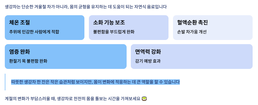 - 생강차는 몸을 데워 추위에 민감한 사람에게 적합함