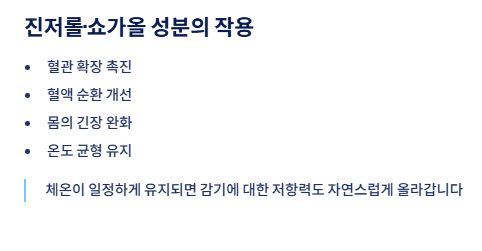 생강의 따뜻한 성질은 체온 유지에 도움을 주고, 항산화 작용은 감기에 대한 저항력을 높이는 데 기여할 수 있습니다.