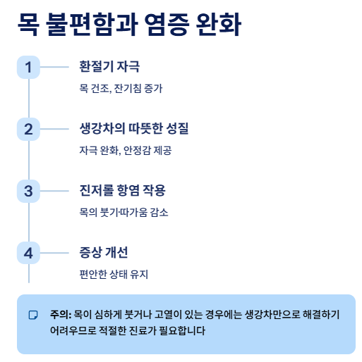 진저롤 성분의 항염 작용이 목의 붓기나 따가운 느낌을 완화하는 데 관여하며, 따뜻한 온도가 추가로 안정감을 주어 자극을 부드럽게 낮춰 줍니다.