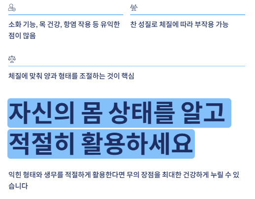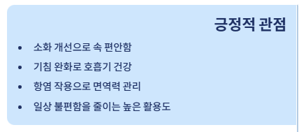 소화 개선, 기침 완화, 항염 작용 등 일상적인 불편함을 줄여주는 데 도움을 주어 활용도가 매우 높습니다. - 주의 관점: