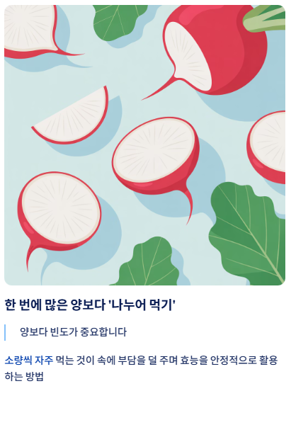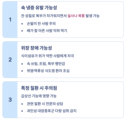 무의 식이섬유는 적당량일 때는 도움이 되지만, 위가 약한 사람에게는 오히려 자극이 될 수 있습니다.