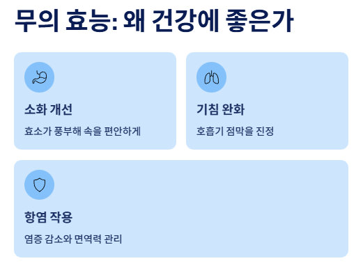 무는 소화 기능을 돕고 목을 편안하게 해주며 염증을 완화하는 등 일상 건강에 유익한 점이 많은 식품입니다. 하지만 찬 성질을 가지고 있어 체질이나 위장 상태에 따라 부작용이 나타날 수도 있습니다.