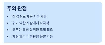 성질이 차기 때문에 체온이 쉽게 떨어지는 사람이나 위가 약한 사람에게는 오히려 불편함을 유발할 수 있습니다. 특히 생무는 자극이 될 수 있으므로 섭취량을 조절해야 합니다.