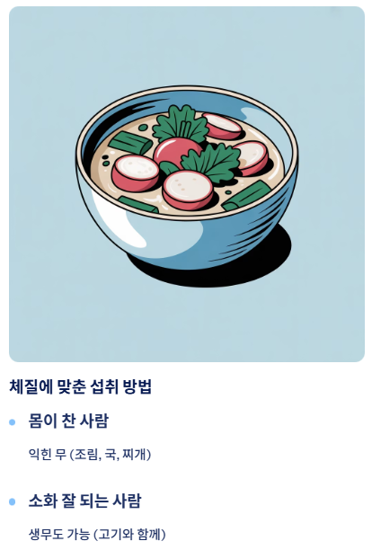 평소 손발이 차거나 배가 잘 아픈 사람은 생무를 많이 먹기보다 익혀 먹는 것이 좋습니다. 조리 과정에서 차가운 성질이 완화되기 때문에 몸이 약한 사람도 비교적 부담 없이 섭취할 수 있습니다.