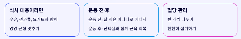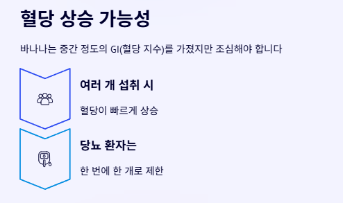 바나나는 GI(혈당 지수)가 중간 정도지만, 한 번에 여러 개를 먹으면 혈당이 빠르게 오를 수 있습니다.