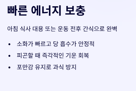 빠른 에너지 공급과 포만감을 동시에 얻을 수 있어 한 끼 대안으로 적절합니다.