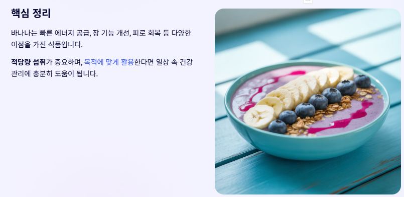 핵심은 목적에 맞게 먹는 것입니다. 에너지 보충, 장 관리, 운동 전후 간식 등 자신에게 맞는 방식으로 적절히 활용한다면 바나나는 일상 속 건강 관리에 충분히 도움이 되는 과일입니다.