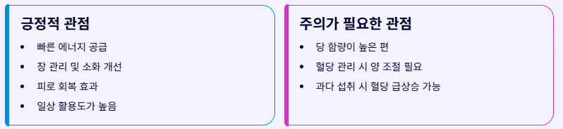 빠른 에너지 공급, 장 관리, 피로 회복 효과가 있어 일상에서 활용도가 높습니다. - 주의가 필요한 관점: