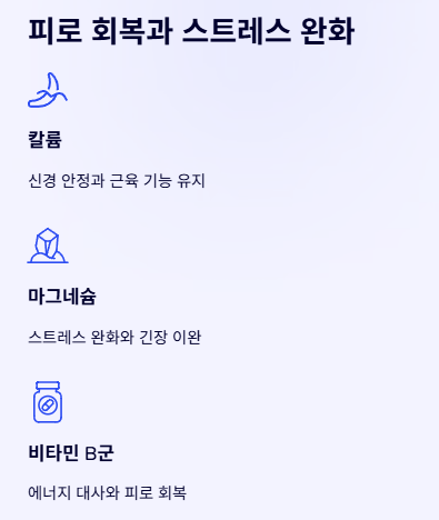 바나나에는 칼륨, 마그네슘, 비타민 B군이 포함되어 있어 피로를 완화하고 신경을 안정시키는 데 기여합니다.