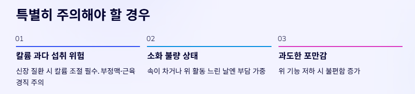 칼륨이 과하게 쌓이면 부정맥이나 근육 경직 같은 문제가 나타날 수 있으므로, 관련 질환이 있다면 개인 상태에 맞게 섭취해야 합니다.