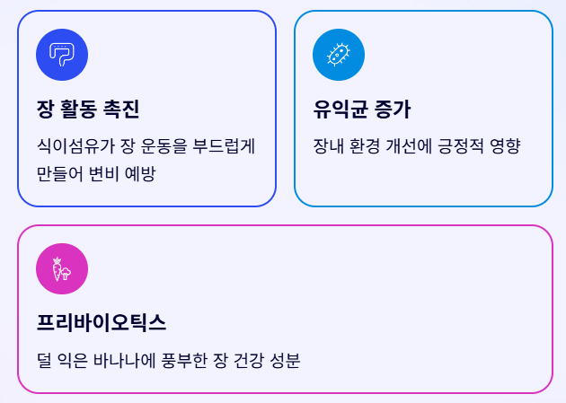 바나나에는 식이섬유가 풍부해 장 활동을 부드럽게 만들어 줍니다. 변비로 고생하는 사람에게는 부담 없이 활용할 수 있는 간식이며, 장내 유익균 증가에도 긍정적인 영향을 줍니다.