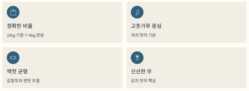 정리하면 절임배추 20kg에 적당한 양념량은 대략 7~9kg, 고춧가루·액젓·무채 비율을 중심으로 구성하는 것이 가장 안정적입니다.