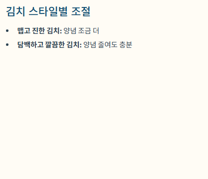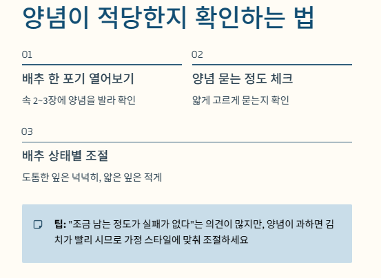 많은 분들은 “조금 남는 정도가 더 실패가 없다”고 말하지만, 반대로 양념이 많으면 김치가 빨리 시다는 의견도 있으니 가정의 김치 스타일에 맞춰 조절하는 것이 좋습니다.