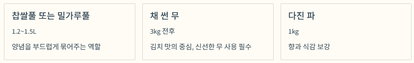 찹쌀풀은 양념 전체를 부드럽게 묶어주는 역할을 하고, 무채는 김치 맛의 중심이 되므로 가능한 한 신선한 무를 사용해야 합니다.