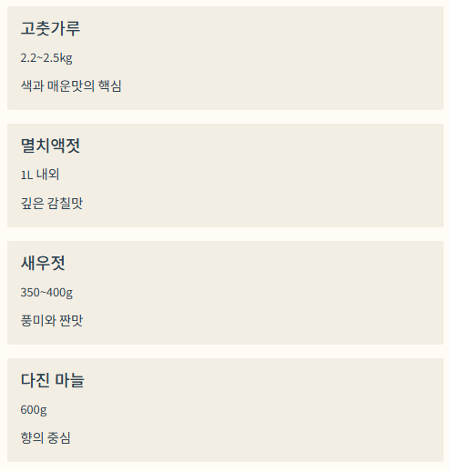 특히 배추는 상태에 따라 양념 흡수도가 다르기 때문에 일정한 비율을 알고 시작하면 김장 과정이 훨씬 쉽습니다.