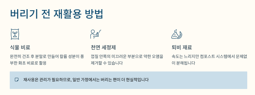 껍질을 완전히 건조한 뒤 잘게 갈면 칼륨 성분이 있어 화초 비료로 사용 가능 - 천연 세정제 재료