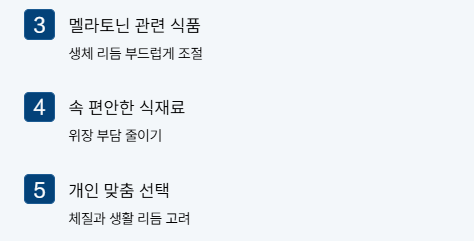일부 식재료에는 멜라토닌 또는 멜라토닌 생성을 돕는 성분이 들어 있어 생체 시계를 자연스럽게 맞추는 데 도움이 됩니다.