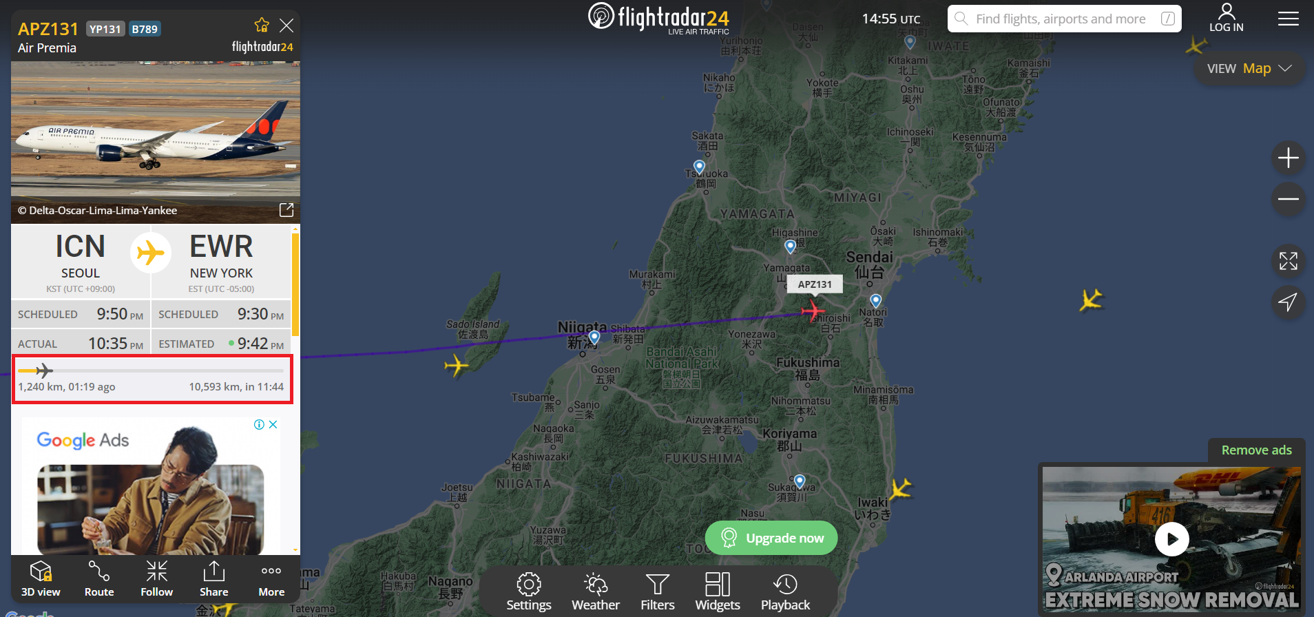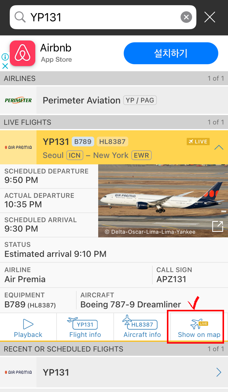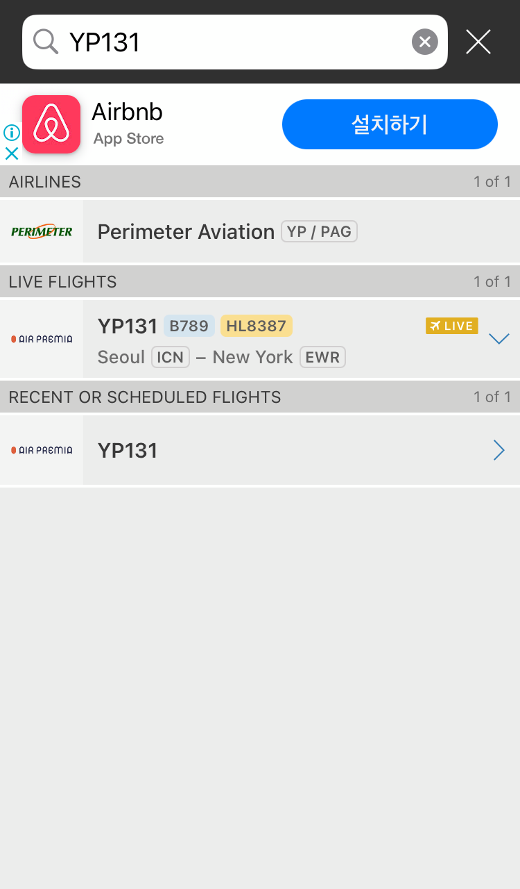 (예시로 항공 편명 YP131 뉴욕직항 에어프레미아 항공편을 검색하였습니다)