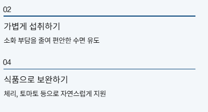 위가 무거우면 오히려 잠들기 어려울 수 있어 간단한 메뉴가 더 적합합니다. - 수면 루틴 만들기
