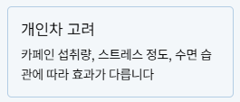 평소 카페인 섭취량, 스트레스 정도, 수면 습관 등에 따라 체감도는 다르게 나타날 수 있습니다.또한 당뇨가 있거나 칼로리 조절이 필요한 경우, 과일이나 견과류의 양을 조절해야 할 때도 있습니다.