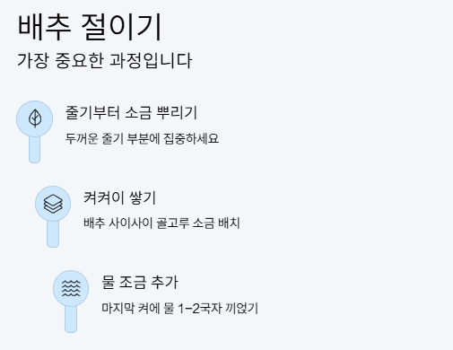 이 흐름만 기억하면 어떤 환경에서도 원하는 식감의 절임배추를 만들 수 있습니다.
