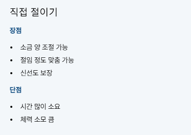 직접 절이면 소금 양과 절임 정도를 조절하기 쉽다는 장점이 있지만, 시간이 오래 걸리고 체력 소모가 큽니다.