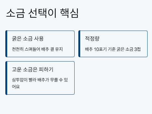 잘못된 소금을 사용하면 배추가 과하게 무르거나, 지나치게 짜게 될 수 있습니다.