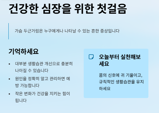 가슴 두근거림은 누구에게나 나타날 수 있는 흔한 증상이지만, 원인을 정확히 알고 생활 속에서 관리하면 충분히 예방할 수 있습니다.