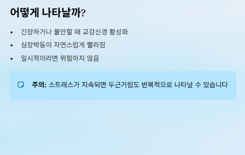 일시적이라면 위험하지 않지만, 스트레스가 지속되면 두근거림도 반복적으로 나타날 수 있습니다.