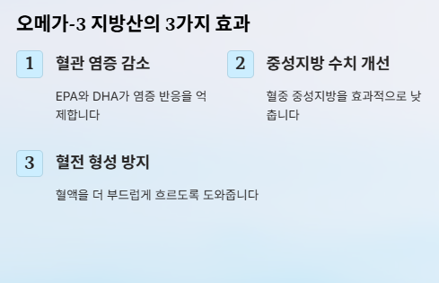 특히 EPA와 DHA는 혈액을 더 부드럽게 흐르도록 도와 혈전 형성을 감소시키는 역할도 합니다.