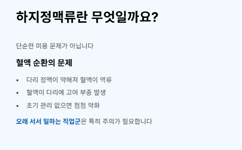 하지정맥류는 단순히 다리가 피곤해서 생기는 문제가 아니라 정맥 기능이 약해져 순환이 떨어지는 증상입니다.