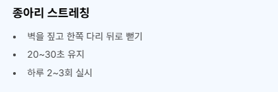 벽을 짚고 한쪽 다리를 뒤로 뻗은 뒤 종아리 뒤쪽이 당길 정도로 20~30초 유지합니다.