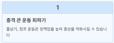 줄넘기, 점프 운동, 하체에 충격이 큰 운동은 정맥압을 높여 증상을 악화시킬 수 있습니다.