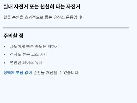 실내 자전거나 천천히 타는 자전거는 혈류 순환을 돕는 데 효과적입니다.