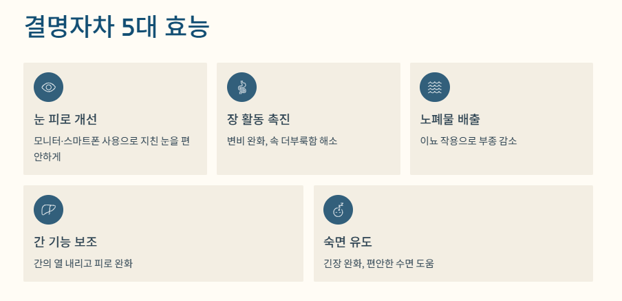 결명자차는 특히 눈의 피로 완화, 장 기능 개선, 숙면 보조 등의 효과로 많이 알려져 있습니다.