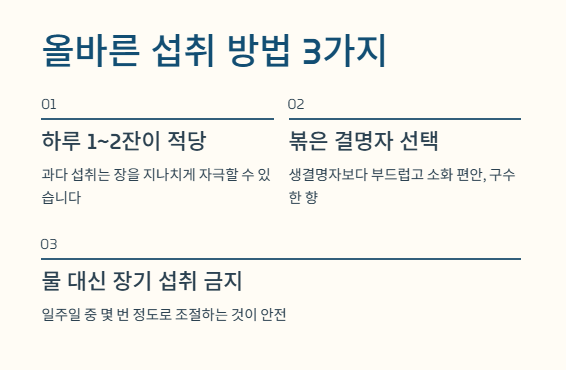 과다 섭취는 장 기능을 지나치게 자극할 수 있으므로 하루 1~2잔이 적당합니다.
