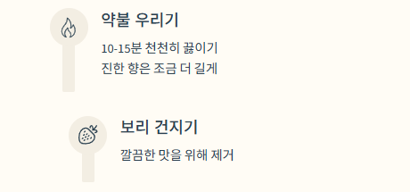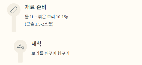 - 물 1L 기준 볶은 보리 10~15g(큰술 1.5~2스푼)