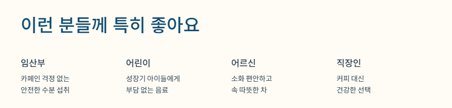 과하지 않으면서도 속이 편안하고, 온 가족이 부담 없이 마실 수 있는 차.