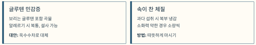 보리차가 대부분의 사람에게 안전하지만, 다음 상황에서는 주의가 필요합니다.