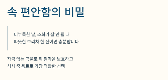 속이 더부룩하거나 소화가 잘되지 않는 날에 따뜻한 보리차를 마시면 편안함이 느껴지는 경우가 많습니다.