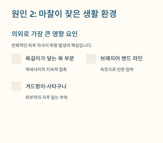 옷, 액세서리, 피부 접힘 등이 반복적으로 자극을 주면 쥐젖이 생길 수 있습니다.
