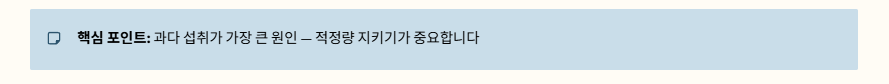 과다 섭취가 가장 큰 원인이므로 양 조절이 핵심입니다.