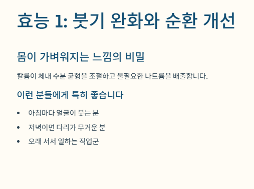 - 칼륨: 체내 나트륨 배출을 돕고 붓기 완화에 기여
