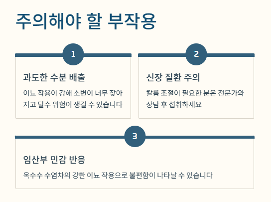 옥수수 수염차는 이뇨 작용이 강한 편이라, 민감한 사람은 불편함이 나타날 수 있습니다. 일반 옥수수차는 비교적 안전하지만, 개인 차이가 있으므로 적당량을 권합니다.