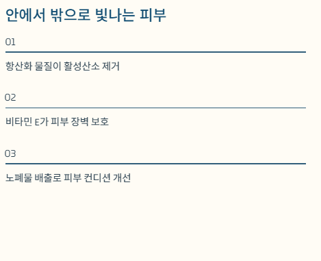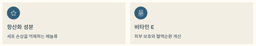 - 비타민 E: 피부 보호 및 혈액 순환 도움