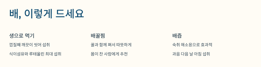 - 기관지 건강 (감기 예방 및 완화): 배의 루테올린 성분을 위해 껍질째 깨끗이 씻어 섭취하거나, 따뜻한 성질의 꿀과 함께 쪄서 배숙으로 만들어 먹는 것이 가장 효과적입니다.