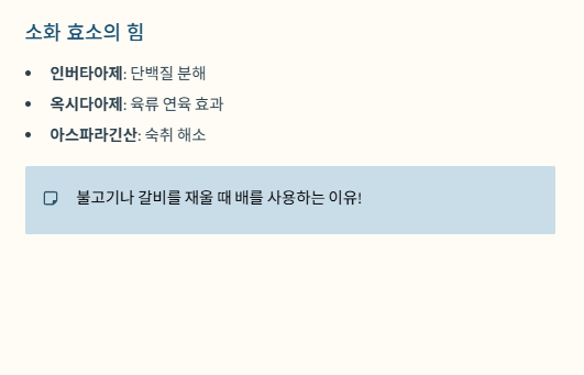 배에는 '인버타아제(invertase)'와 '옥시다아제(oxidase)' 등의 소화 효소가 다량 함유되어 있습니다. 특히 육류의 단백질을 분해하는 효소가 포함되어 있어, 고기를 먹은 후 배를 먹으면 소화가 잘되도록 돕습니다. 한국에서 불고기나 갈비를 잴 때 배를 사용하는 것도 이러한 연육 작용을 활용하기 위함입니다.