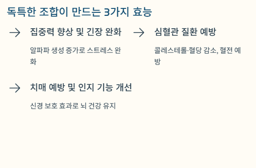 - 5. 집중력 향상 및 긴장 완화: L-테아닌은 뇌의 알파파 생성을 증가시켜 스트레스로 인한 긴장감을 완화하고 집중력을 높이는 데 도움을 줍니다.